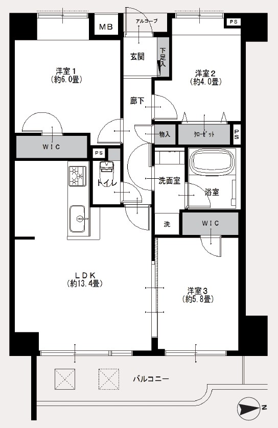 | 専有面積 | 67.2m² (20.32坪) (壁芯) | 間取り | 3LDK +2WIC |
