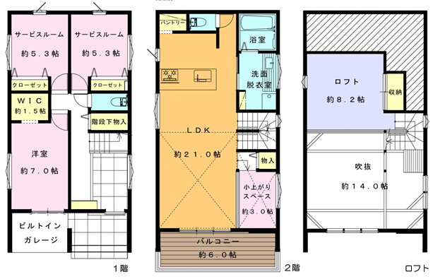 小上がり・ワークスペースや秘密基地のようなロフト、WIC、大型ルーフバルコニー、ビルトインガレージなどこだわりの設備仕様。