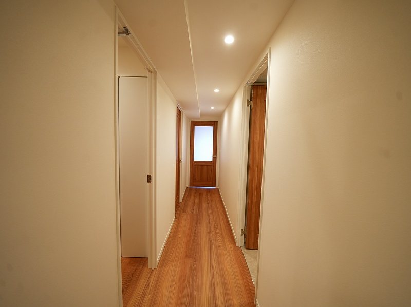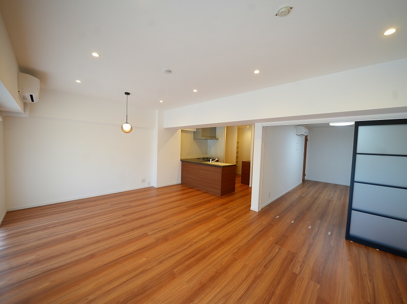 キッチン交換(食洗機付)/ユニットバス交換(追炊き有)/洗面化粧台交換/建具交換/トイレ交換(ウォシュレット一体型)/フローリング張替/クロス全面貼替(一部アクセントクロス)/トイレ交換(ウォシュレット一体型)/ウッドデッキ造成/間接照明・ダウンライト新規設置/カップボード設置/給湯器交換/給排水配管更新(専有部内)/エアコン新規設置(LDK・洋室)/ハウスクリーニング等