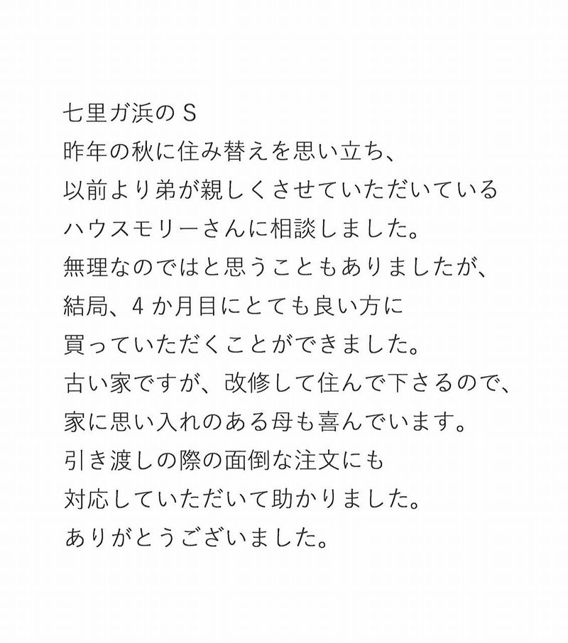 昨年の秋に住み替えを思い立ち、以前より弟が親しくさせていただいているハウスモリーさんに相談しました。