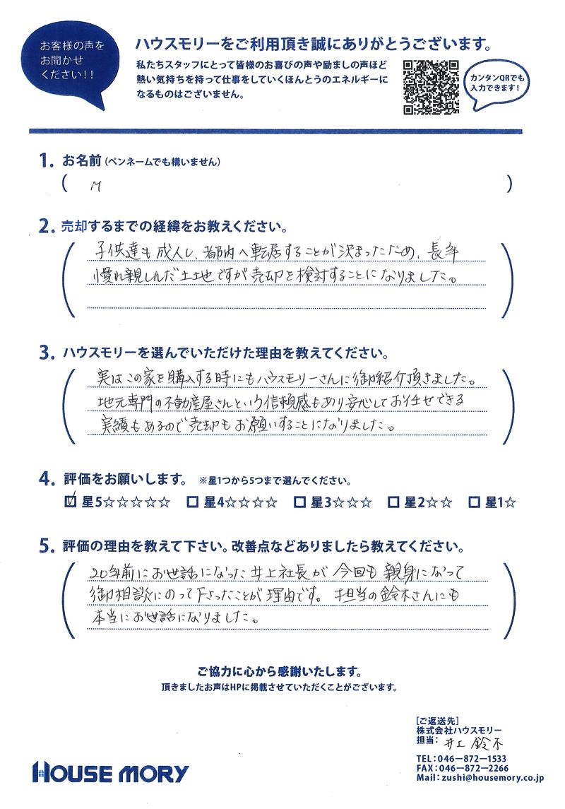 子供達も成人し、都内へ転居することが決まったため、長年慣れ親しんだ土地ですが売却を検討することになりました。