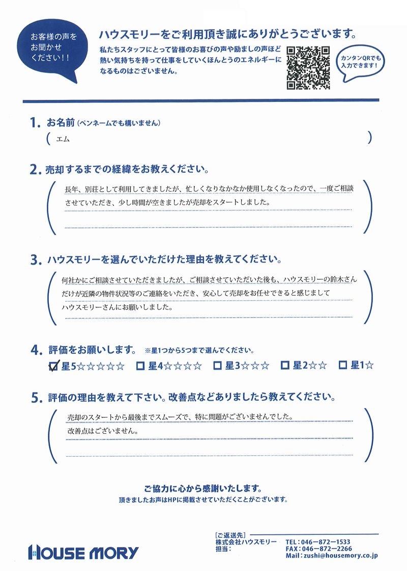何社かにご相談させていただきましたが、ご相談させていただいた後も、ハウスモリーの鈴木さんだけが近隣の物件状況等のご連絡をいただき、安心して売却をお任せできると感じましてハウスモリーさんにお願いしました。