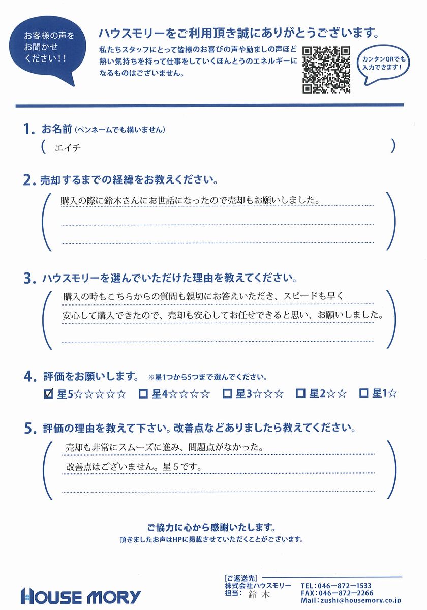 購入の際に鈴木さんにお世話になったので売却もお願いしました。