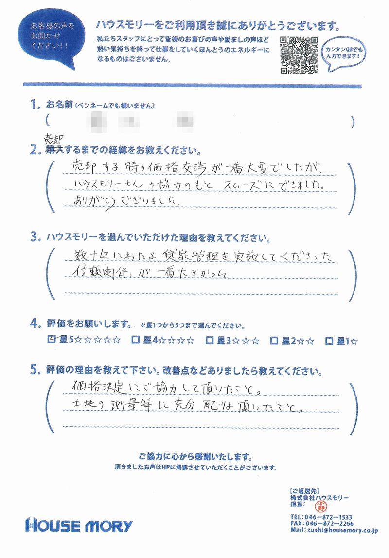 売却する時の価格交渉が一番大変でしたが、ハウスモリーさんの協力のもと、スムーズにできました。