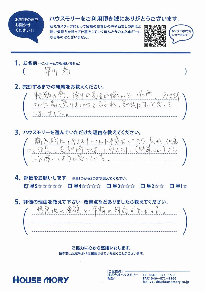 転勤の為、貸すか売るか悩んでいた所、ハウスモリーさんに高く売りましょうと言われ、その気になって売ってしまいました。