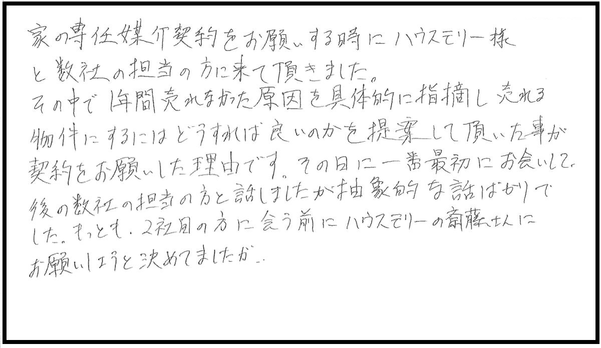 その中で1年間売れなかった原因を具体的に指摘し売れる物件にするにはどうすれば良いかを提案して頂いた事が契約をお願いした理由です。その日に一番最初にお会いして、後の数社の担当の方と話しましたが抽象的な話ばかりでした。もっとも、2社目の方に会う前にハウスモリーの齋藤さんにお願いしようと決めていましたが。
