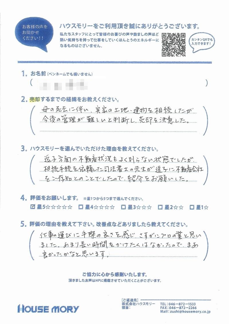 母の死去に伴い、実家の土地、建物を相続したが、今後の管理が難しいと判断し、売却を決意した。