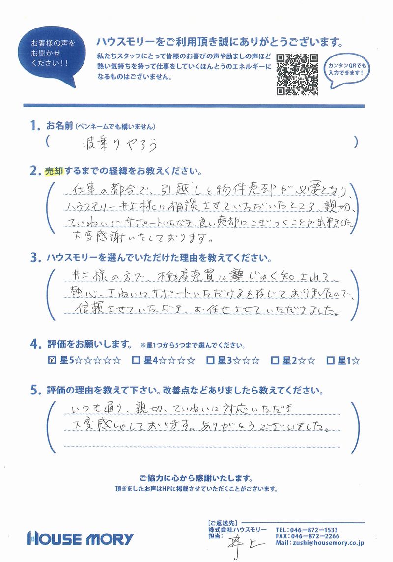 仕事の都合で、引越しと物件売却が必要となり、ハウスモリー井上様に相談させていただいたところ、親切、ていねいにサポートいただき、良い売却にこぎつくことが出来ました。